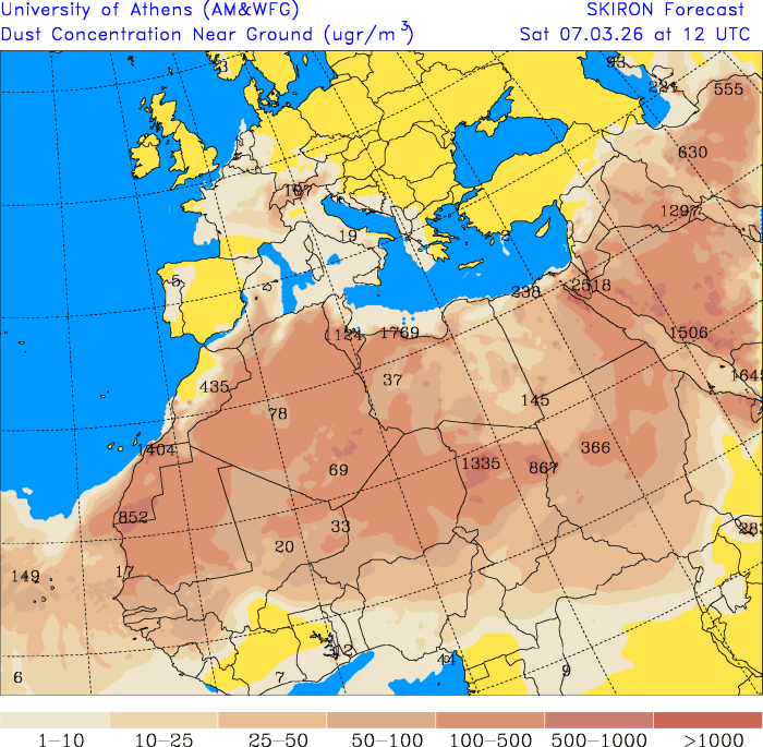 La presenza anticiclonica combinata ad un richiamo mite da sud generato da una depressione presente fra le Baleari e la Spagna, comporterà il transito in quota di particolo sabbioso proveniente da nord Africa. Come possiamo vedere nella mappa in home del modello Skiron centrata a mezzogiorno di sabato 7 marzo, la presenza della sabbia è ben presente su Francia, Svizzera, Italia e Mediterraneo occidentale e Paesi bassi.